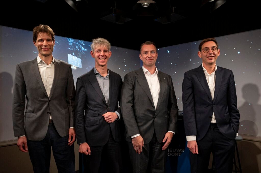 Aaldert van Amerongen (SRON), Maarten van Aalst (KNMI), Jeroen Rotteveel (ISISPACE), and Anton Leemhuis (TNO).